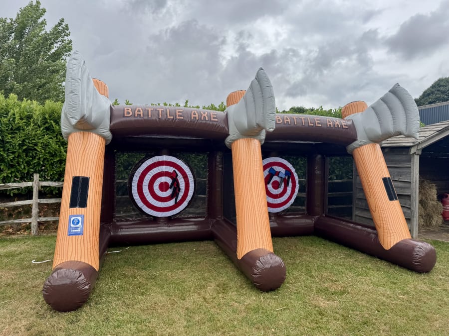 Bring a memorable and safe attraction to your next event with our Twin Axe Throwing lane. Perfect for corporate days, weddings, family BBQs and community fetes, this game is designed for all ages and abilities — no experience required. Players get three axes to throw and must stick them into the Velcro target; land on the bullseye to score big and claim victory! 🏆