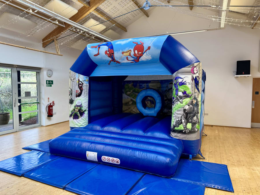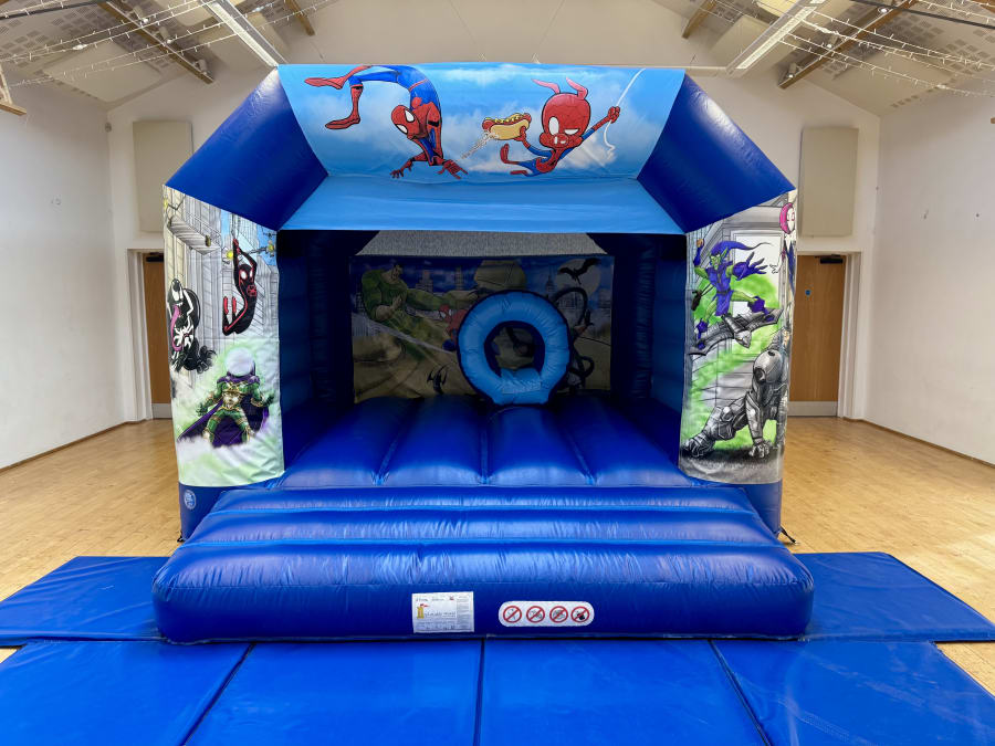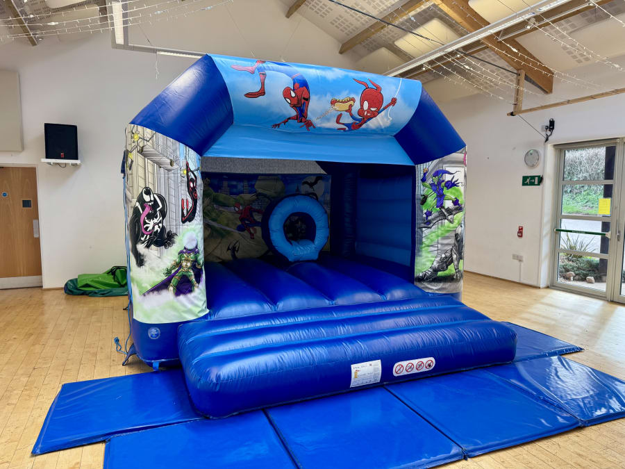 Bouncy Castle Hire 12ft x 12ft Spiderman Bouncy Castle in Torbay, Brixham, Paignton, Torquay, Totnes, Newton Abbot, Kingsteignton, Teignmouth, Dawlish and Exeter is the easiest way to add a splash of Marvel-magic to your party. This popular 12ft x 12ft A-frame inflatable (10ft peak) gives kids plenty of room to bounce, an integrated sewn-in roof for sun or light drizzle, and a built-in jump-through hoop that keeps energy levels sky-high. Perfect for birthdays, community events or a backyard bash. 🎈