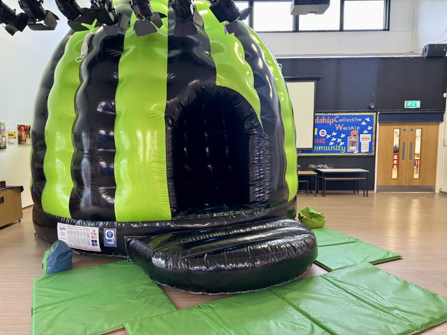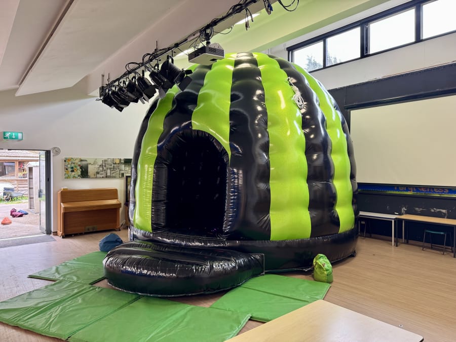 Our huge 20ft Adult Sized Disco Dome will have your guests dancing all night long! Perfect for birthdays, weddings, BBQs, corporate events and more, this adult-friendly dome welcomes kids too — entertainment for all ages. The shimmering green disco-ball effect against a darker backdrop creates instant atmosphere, while two large disco lights and a powerful built-in speaker set the scene for a bouncing nightclub experience in your garden or venue. πŸ•ΊπŸ’ƒ