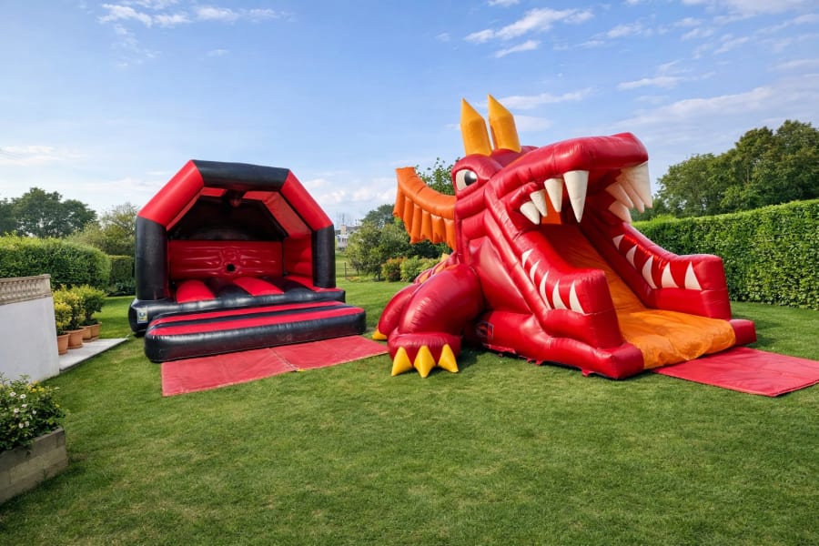 - Big impact: A dramatic dragon assault course paired with a large red-and-black bouncy castle creates a polished, professional look that stands out on any site. 🔴⚫